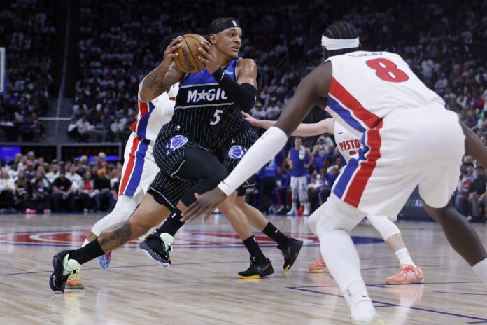 Paolo Banchero collected 23 points and nine rebounds as the visiting Orlando Magic never trailed in upsetting the top-seeded Detroit Pistons 112-101 in Game 1 of their Eastern Conference first-round series on Sunday.
