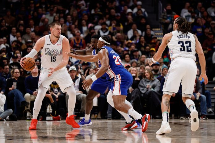 Nikola Jokic had 27 points, 13 rebounds and 10 assists for his fourth straight triple-double and the host Denver Nuggets beat the reeling Philadelphia 76ers 144-109 on Tuesday night.