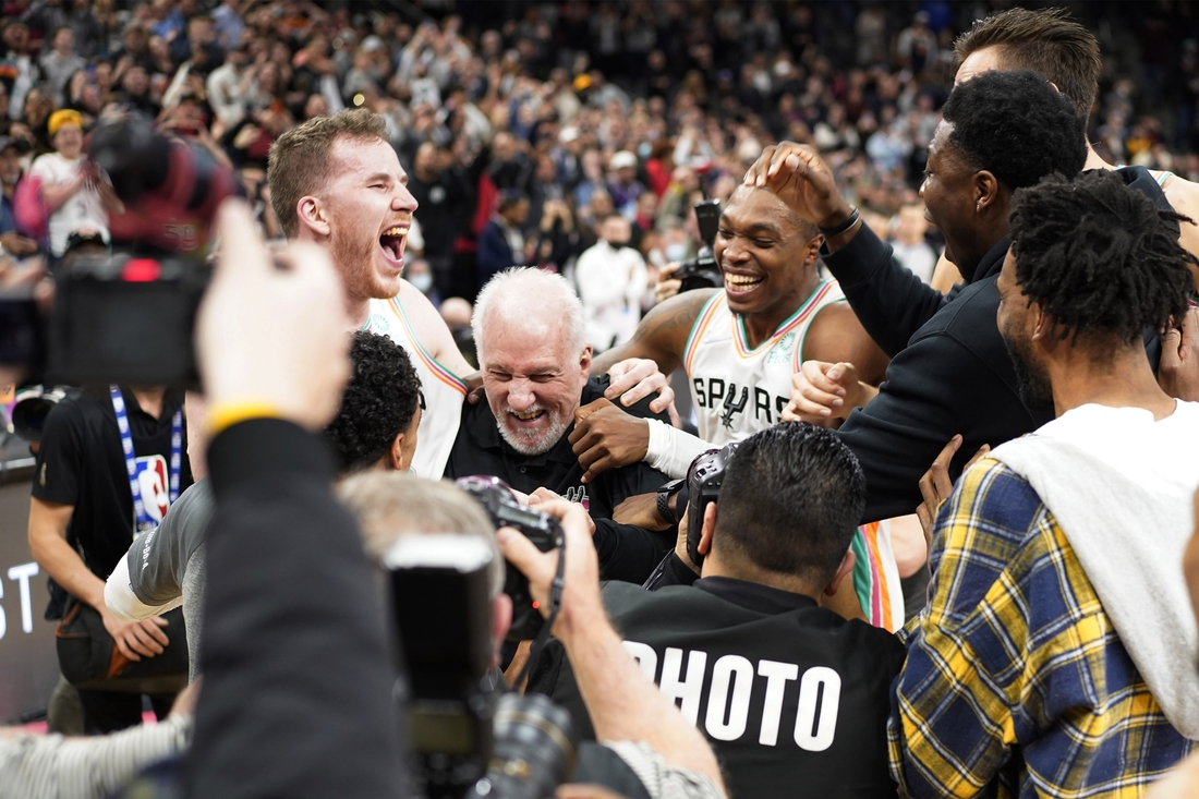 The Spurs players kept Popovich on the court to soak in the applause from the home fans after his team rallied for a 104-102 win over the Utah Jazz. He looked uncomfortable amid the attention but finally cracked a smile.