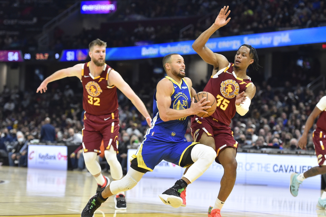 Stephen Curry saved 20 of his game-high 40 points for the final 12 minutes as the Golden State Warriors rallied from a 13-point deficit to defeat the host Cleveland Cavaliers 104-89 on Thursday.