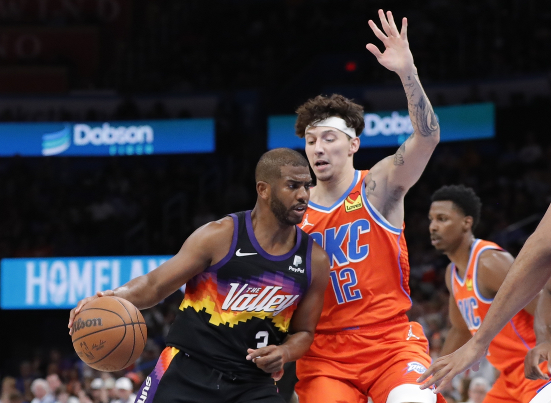 Suns star Chris Paul played in his first game in Oklahoma City with fans present since the Thunder traded him to Phoenix before last season, and he was greeted by a loud ovation during introductions. He finished with 11 points and nine assists.