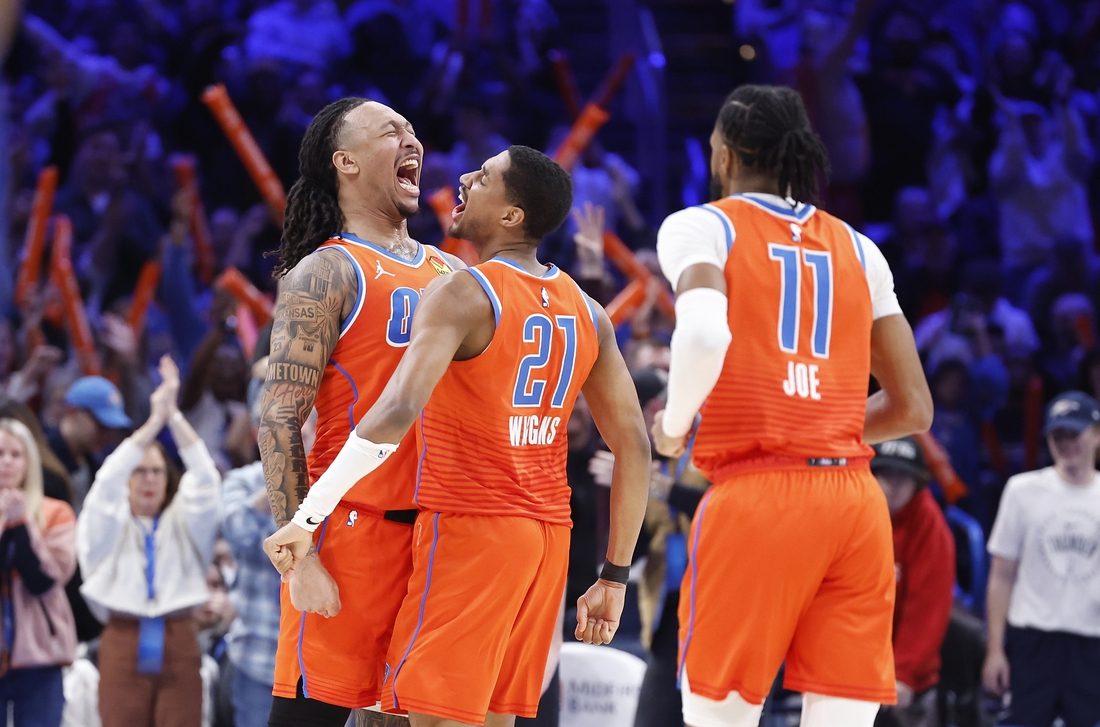 Aaron Wiggins scored a season-high 19 points — 15 in the fourth quarter — as the host Oklahoma City Thunder stretched their winning streak to 14 games with a 117-107 win over the New York Knicks on Friday.