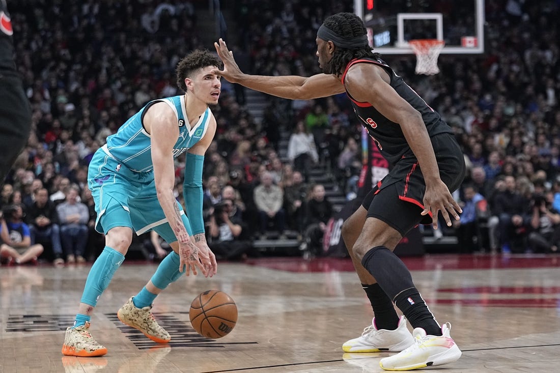 Ball and Siakam each had 18 points in the first half with Toronto shooting 59.5 percent (25-for-42) from the field and Charlotte shooting 51.2 percent (21-for-41).
