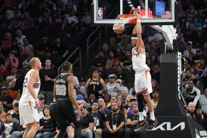A basket and a 3-pointer by Branham over the first 1:22 of the second quarter stoked San Antonio’s advantage to 10 points. The Spurs were still up 42-33 before Phoenix found its stride, reeling off a 20-3 run capped by Beal’s 3-pointer to take the lead at 53-45 with 1:01 to play in the first half. The Suns settled for a 53-47 lead at the break.