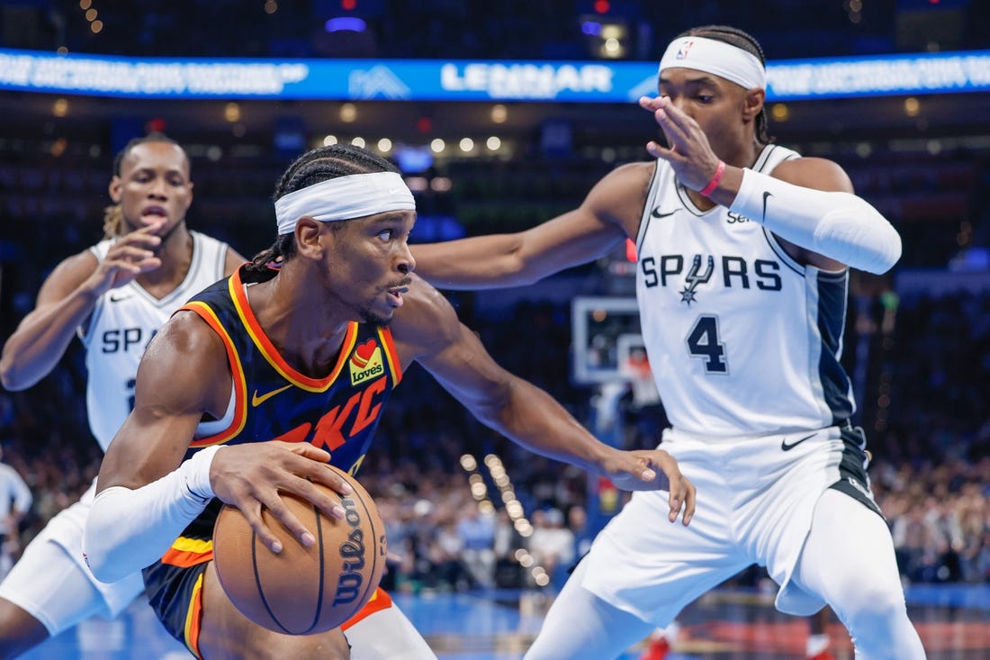 His lowest output of the five came in Oklahoma City’s most recent outing, a 123-87 home romp over the San Antonio Spurs in a made-for-TV affair between young big men Holmgren and Victor Wembanyama. With 28 points, Gilgeous-Alexander outscored the two of them combined (Holmgren had nine, Wembanyama eight).