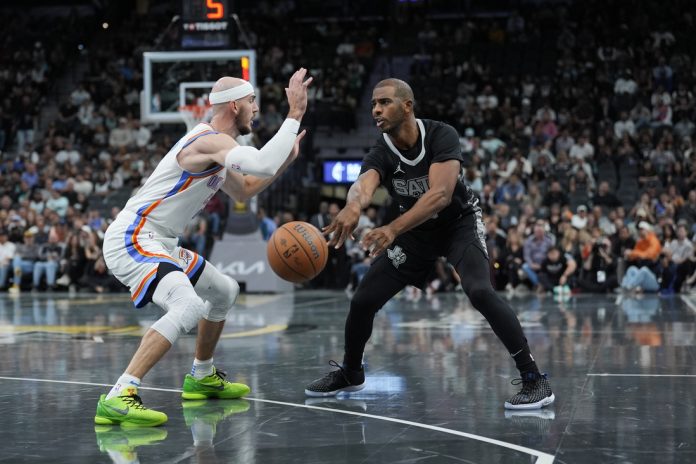 Keldon Johnson poured in 22 points and Chris Paul had a double-double that included a crucial 3-pointer with 1:27 left as the short-handed San Antonio Spurs held on to beat the Oklahoma City Thunder 110-104 on Tuesday in a wild West Group B game in the NBA Cup.