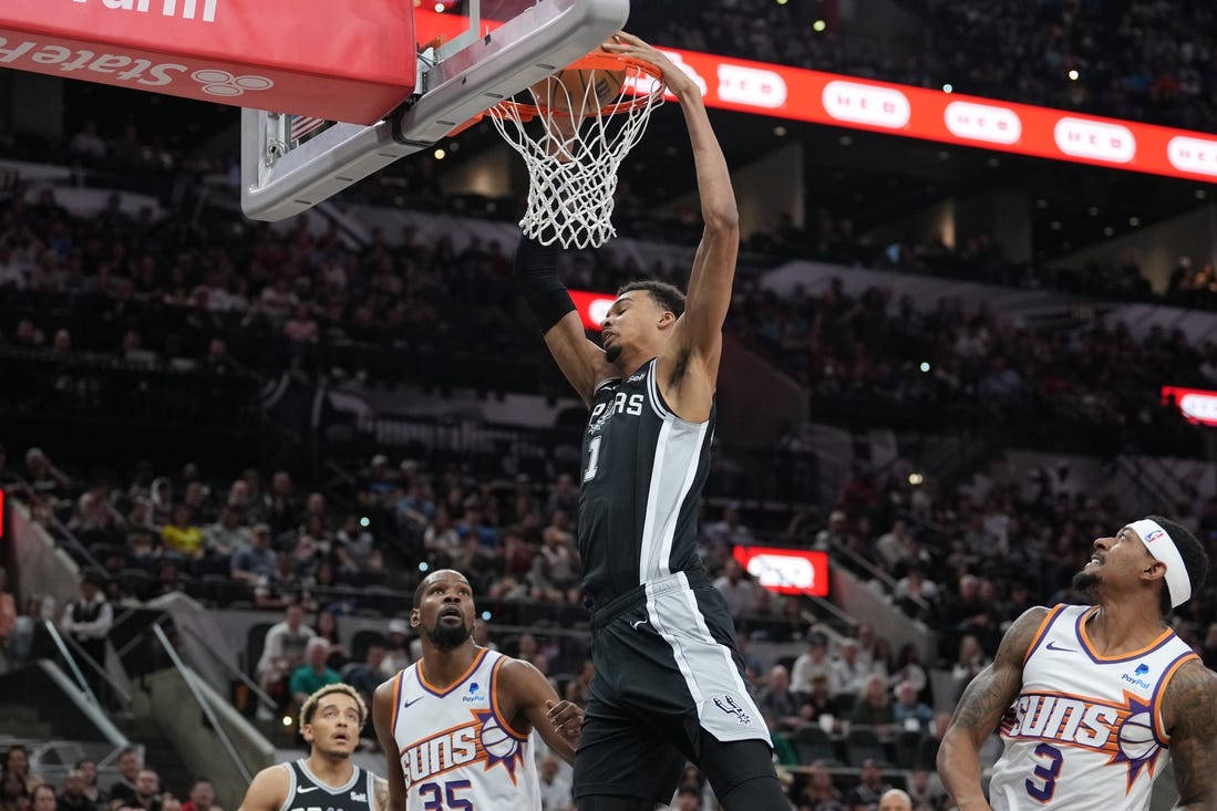 San Antonio Spurs rookie center Victor Wembanyama will miss Monday night’s game against the Phoenix Suns with a sprained left ankle.