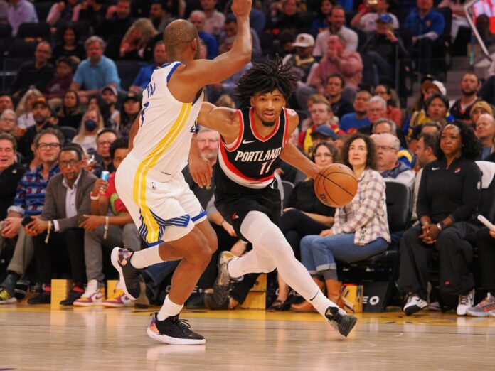In his first game since suffering a torn ligament in his right thumb on opening night, Anfernee Simons poured in 28 points and Shaedon Sharpe had 26 points for the Trail Blazers, who lost despite outscoring Golden State 48-30 on 3-pointers.
