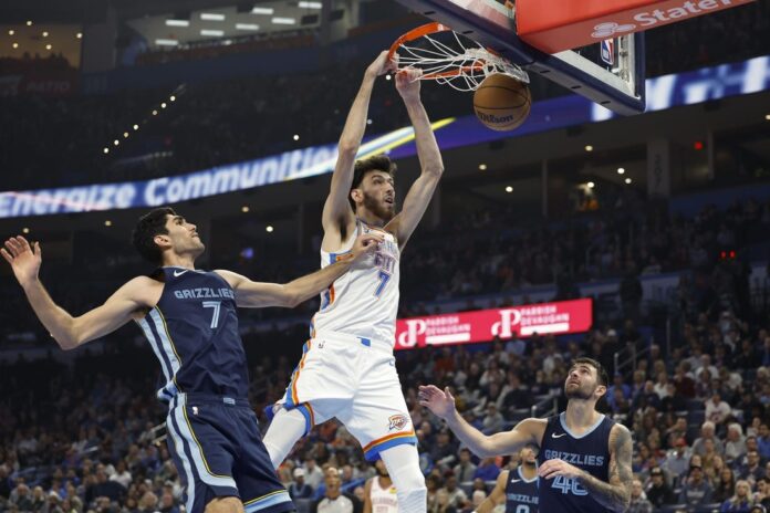 Thunder rookie Chet Holmgren, who was coming off a career-high eight blocks in Saturday’s win at Denver, picked up where he left off.