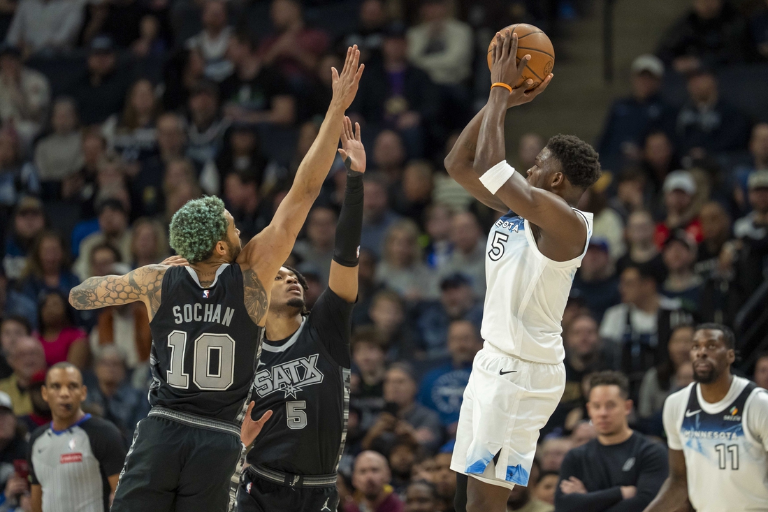 Anthony Edwards scored 25 points on 10-for-15 shooting, and the Minnesota Timberwolves pulled away for a 141-124 win over the San Antonio Spurs on Sunday night in Minneapolis.