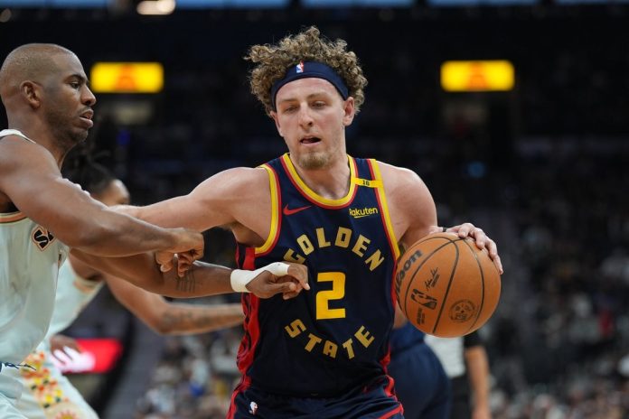 The Warriors put their final stamp on the game by outscoring San Antonio by 14 points in the third quarter, leading by 39 after a trey from Podziemski with 52 seconds left in the period.