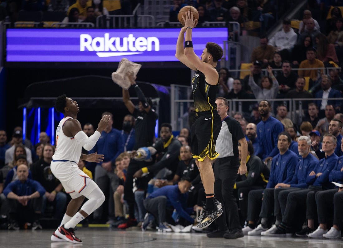 The Warriors led by as many as 22 points in a first half that saw Wiggins (three), Thompson (three) and Curry (two) combine for eight 3-pointers on 18 attempts. As a team, the Knicks went 6-for-18 from beyond the arc over those same 24 minutes, which ended with the visitors down 61-50.