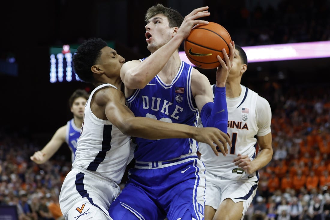 With the score tied at 58-58 and 1.2 seconds remaining, Duke’s Kyle Filipowski drove to the basket and attempted a contested finish over Virginia’s Reece Beekman and Ryan Dunn.