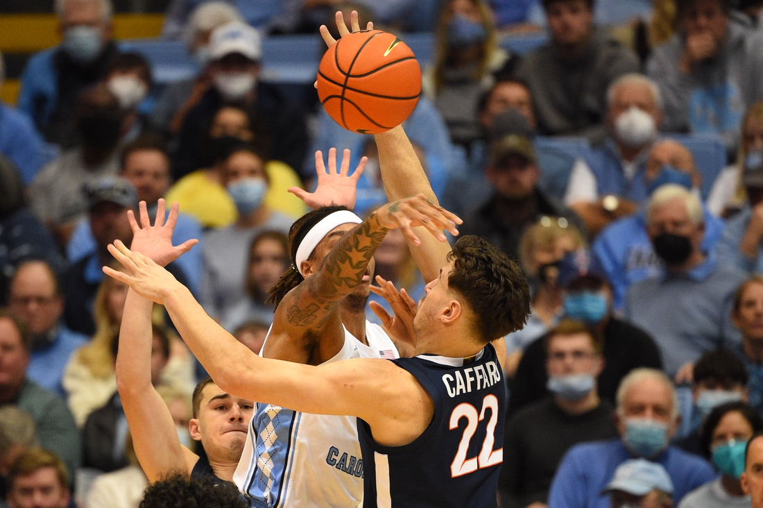 North Carolina led most of the first half but Virginia stayed close until the final five minutes. Love sparked the Tar Heels with two jumpers from well beyond the 3-point arc. He also had a steal and a pull-up shot in transition during the spree to help North Carolina to its biggest lead of the half, 31-24.