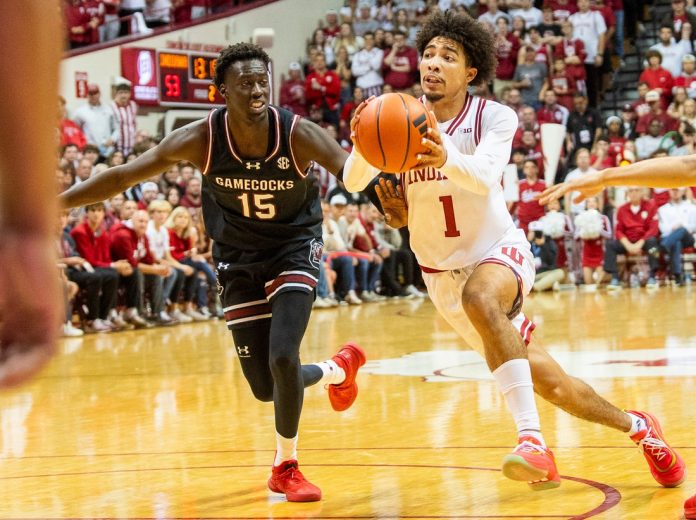 Indiana’s Myles Rice posted 23 points against South Carolina. He hit three of the Hoosiers’ eight 3-point baskets.