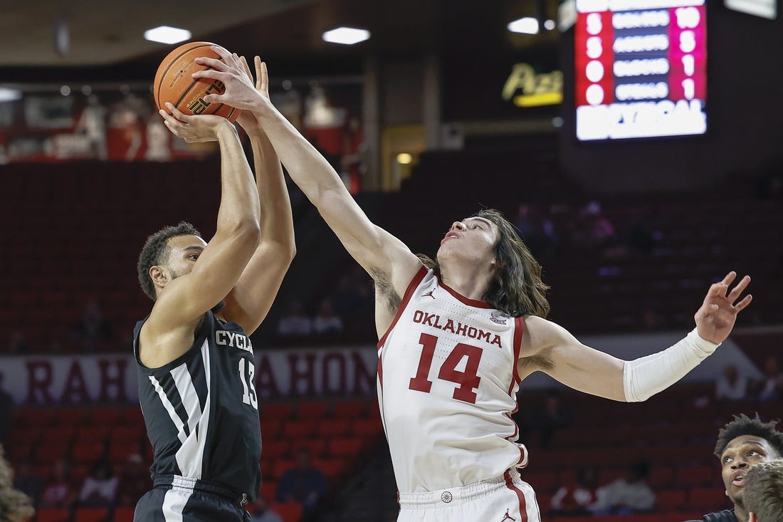 While Iowa State began hot from the floor, Oklahoma struggled on offense. The Sooners started 2 of 8 from the floor, were outrebounded 9-4 early and turned the ball over three times during that initial push — all leading to points on the other end for the Cyclones.