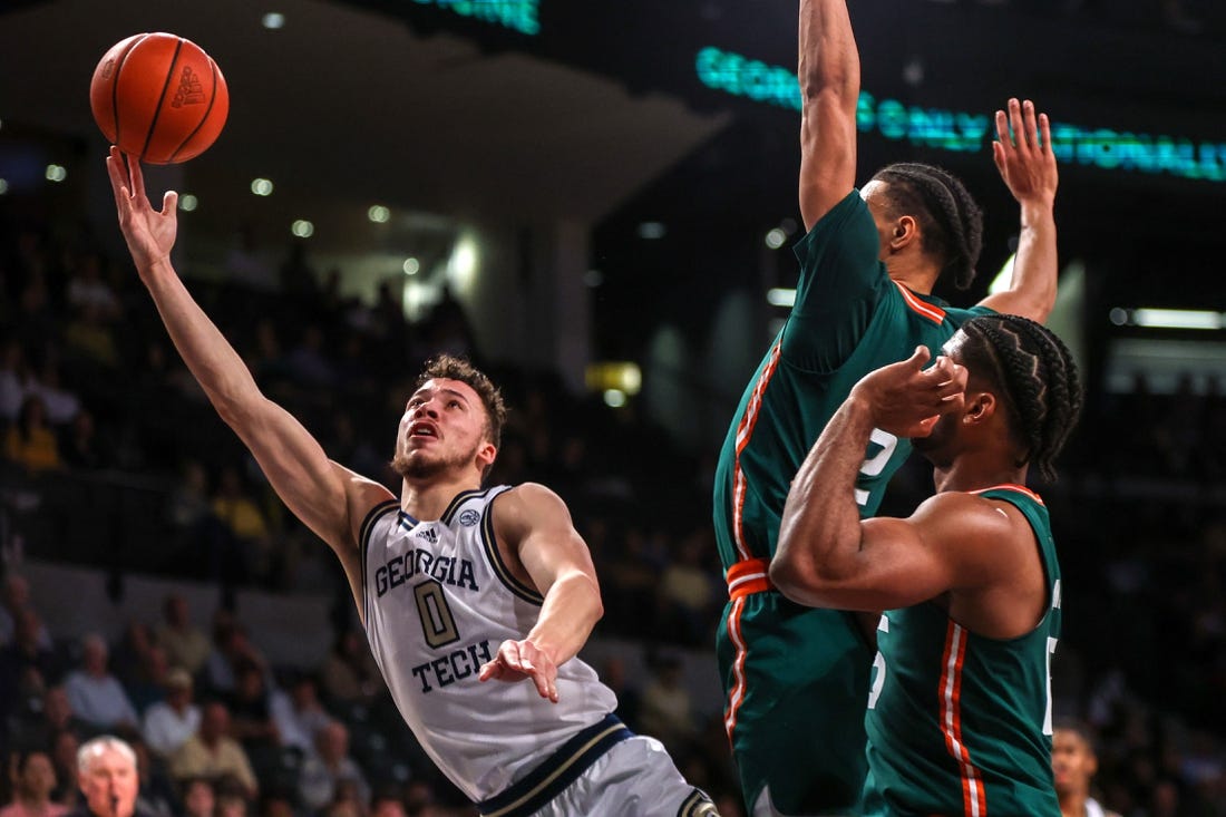 The Yellow Jackets (8-6, 1-3 Atlantic Coast Conference) upset No. 12 Miami 76-70 Wednesday night, overcoming a six-point deficit with a 12-0 closing run in the final five minutes.