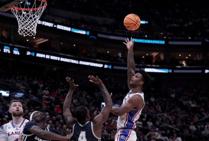 KJ Adams Jr. scored 20 points and Nicolas Timberlake added 19 points for fourth-seeded Kansas (23-10). Johnny Furphy added 16 points and eight rebounds and Dajuan Harris Jr. had 13 points and seven assists for the Jayhawks, who never trailed but nearly let a 22-point, second-half lead slip away.