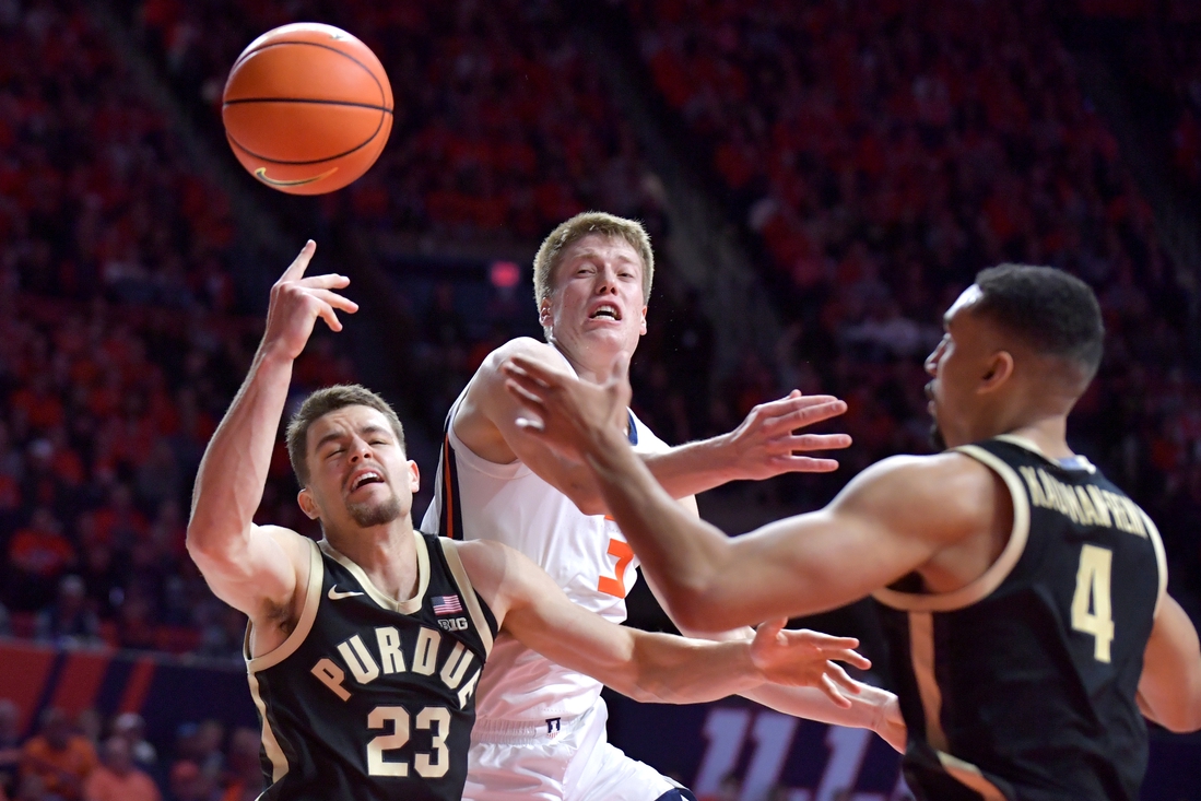 Purdue seized its biggest lead at 63-53 on Smith’s driving layup with 11:34 to go, but Illinois responded with 10 quick points. White’s corner 3-pointer forged a 63-63 tie with 8:46 left. When Ben Humrichous swished a trey from the other corner at the 7:39 mark, the Illini claimed their first lead about midway through the first half.