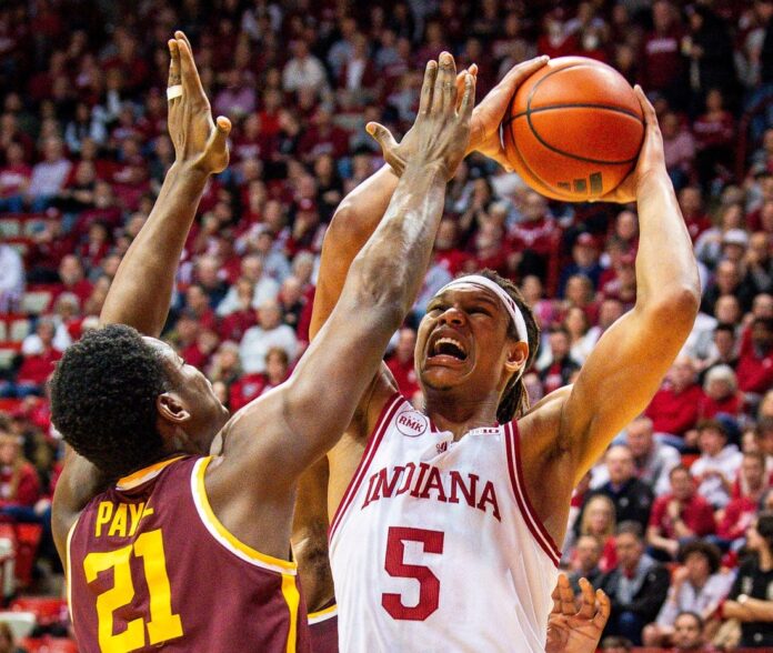 Elijah Hawkins made a jump shot to cut Minnesota’s deficit to 45-35 with 17:22 remaining. Indiana scored the next 11 points, starting with a three-point play by Ware. He finished the scoring outburst with an assist on a 3-pointer by Galloway that made it 56-35 with 15:08 to go.