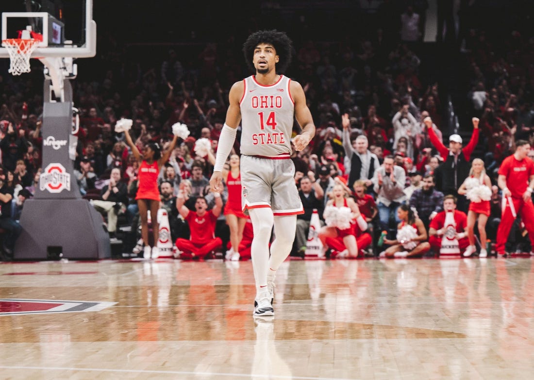 In the previous two games he was 3 for 17 from the field, including 0 for 6 from beyond the arc, and scored a total of eight points. By the half against the Buckeyes, he hit 7 of 9 from the floor, including 6 of 7 from long range.