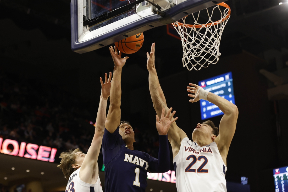 Virginia trailed Navy by seven points at halftime and finally drew even with the Midshipmen at 53-53 on a pair of free throws by Armaan Franklin with 10:46 left. But at that point, both teams went ice-cold from the floor. After Navy regained the lead on Greg Summers’ basket with 9:55 left, making it 55-53, Virginia tied it on Kadin Shedrick’s basket with 8:45 left.