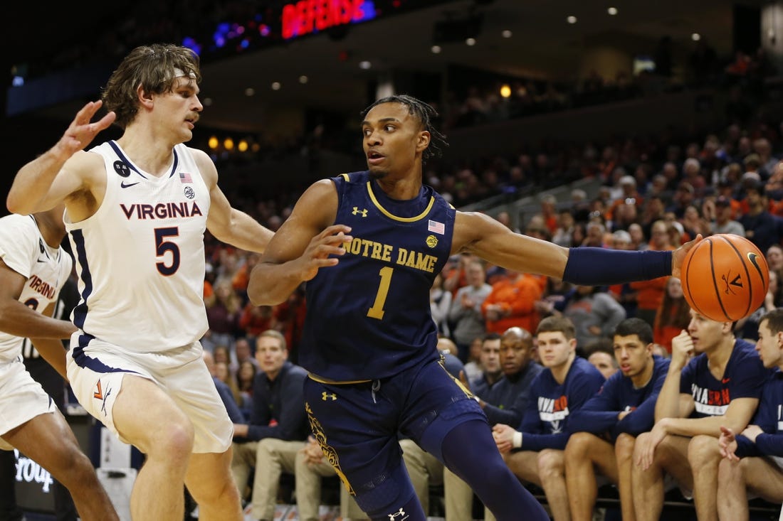 In the first half, Virginia took the lead early and increased it to nine points at 24-15 as Notre Dame had a 6:28 stretch without a field goal as it committed three turnovers and missed six shots.