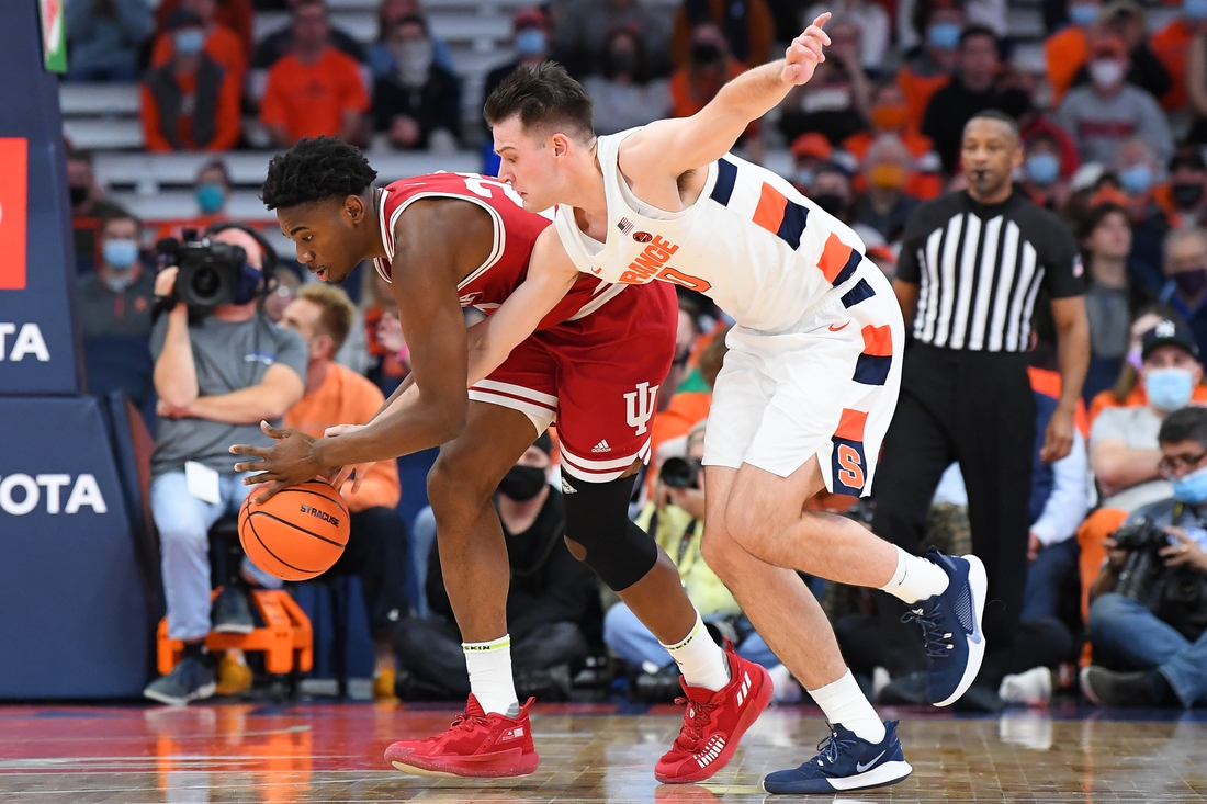 Syracuse shot 60 percent from the field and 53.3 percent (8 of 15) from 3-point range in the first half to jump to a 49-33 halftime lead. The Orange were also active defensively, scoring 16 points off 13 first-half Indiana turnovers.