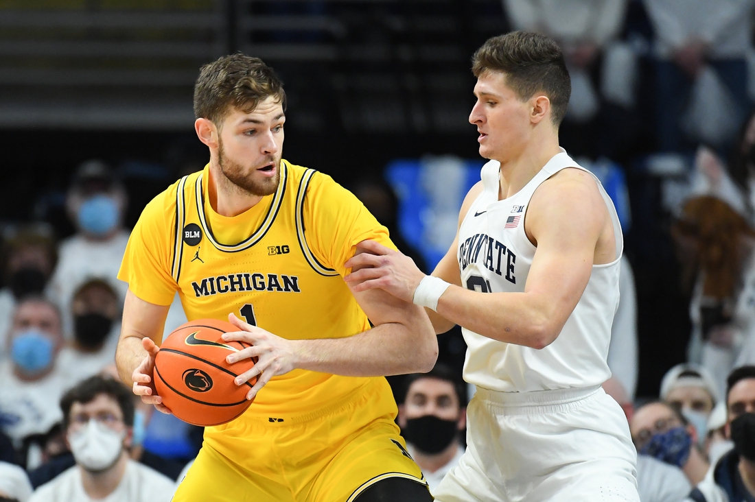 Hunter Dickinson amassed 19 points and 15 rebounds to lead Michigan to a 58-57 win over Penn State on Tuesday in University Park, Pa.