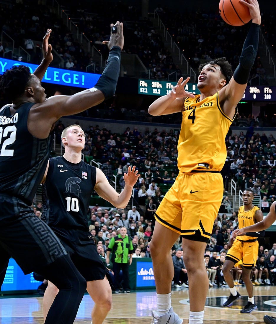 Back-to-back 3-pointers by Hauser and Akins stretched the Spartans’ lead to 52-29. Oakland’s next basket was a Townsend 3-pointer.