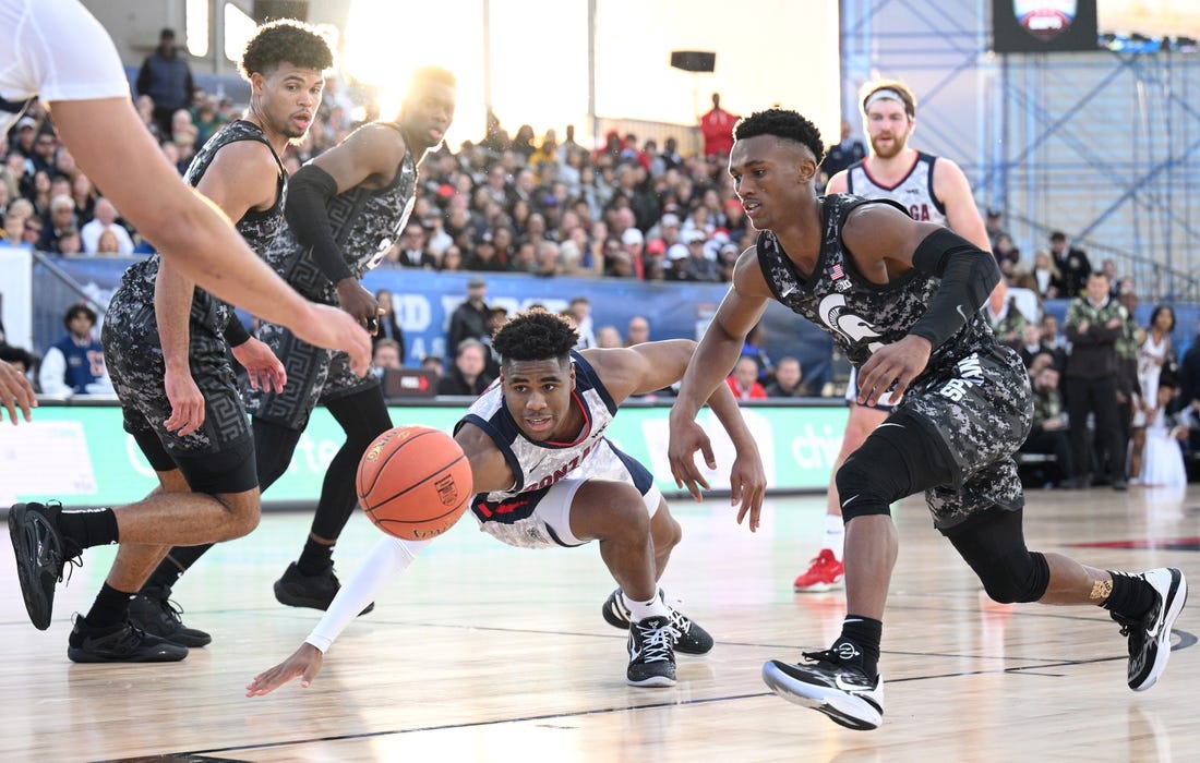 Drew Timme recorded 22 points and 13 rebounds and No. 2 Gonzaga squeaked out a 64-63 victory over Michigan State on Friday night in the Armed Forces Classic on the flight deck of the USS Abraham Lincoln in San Diego.
