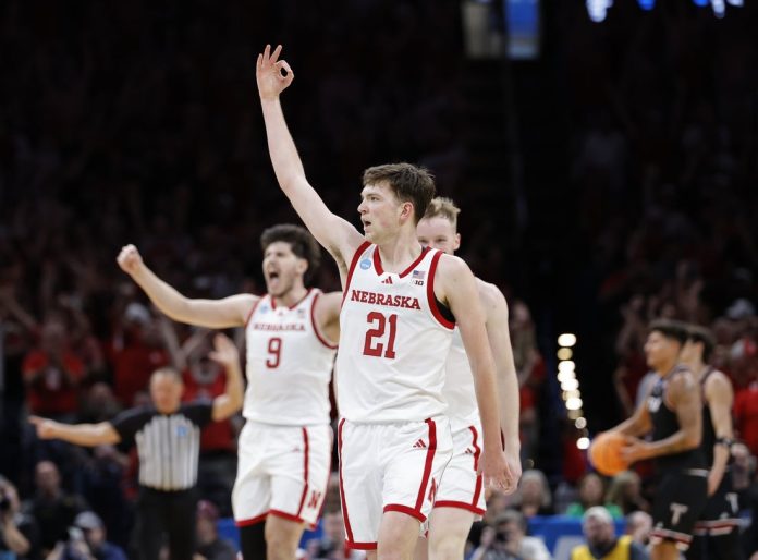 Pryce Sandfort sank seven 3s and scored a game-high 23 points, leading the fourth-seeded Cornhuskers’ lopsided first-round win over Troy, 76-47.