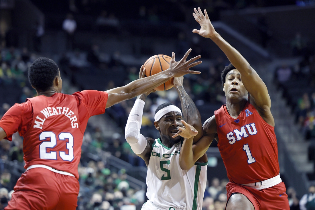 Oregon (2-0) scored 22 points off 16 SMU turnovers and outrebounded the Mustangs 39-27. The Ducks had a huge edge in points in the paint, 48-20.