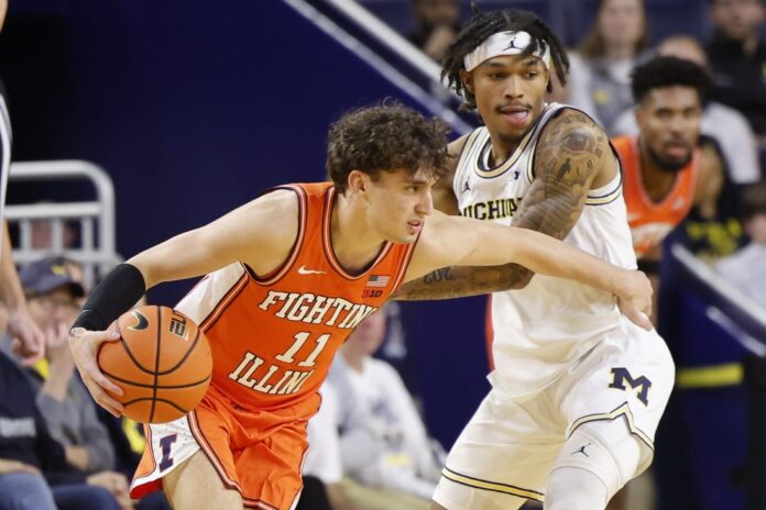 Michigan’s Nimari Burnett made two free throws before Illinois finished its scoring binge with seven straight points. Hawkins made a layup, Guerrier had a free throw and a layup and Harmon sank two free throws to complete the run.
