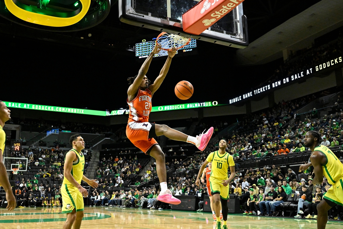 In the night’s only matchup of Top 25 teams, it took Illinois a few minutes to get going. It didn’t score until Humrichous hit a short jumper at the 16:45 mark and trailed 7-2 before hitting Oregon with a 12-0 run. Gibbs-Lawhorn capped that burst with a driving layup with 13:10 left.