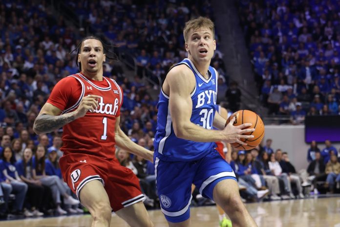 The Cougars led by just four points at halftime but took control midway through the second half. Leading 54-49 after Little’s layup with 11:52 left, BYU ripped off 12 straight points for a 66-49 advantage at the 6:46 mark on two foul shots by Mawot Mag. Utah didn’t score for a span of 5:22.