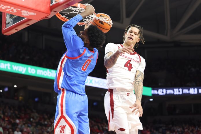 An Ole Miss 10-5 run capped by Dia’s dunk made it 15-11, before the Razorbacks got a big 3-pointer from Johnell Davis for a 20-13 advantage.