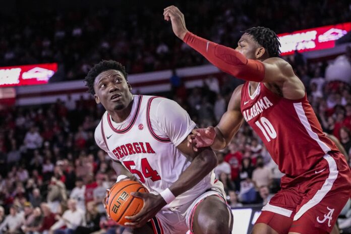 Alabama twice trimmed its deficit to nine in the first half, the second time after Aaron Estrada scored five straight points to pull the Crimson Tide within 30-21. Georgia’s 7-0 burst pushed the margin back to 16 points, and it led 41-27 at the break after Thomasson’s jumper with 38 seconds to go.