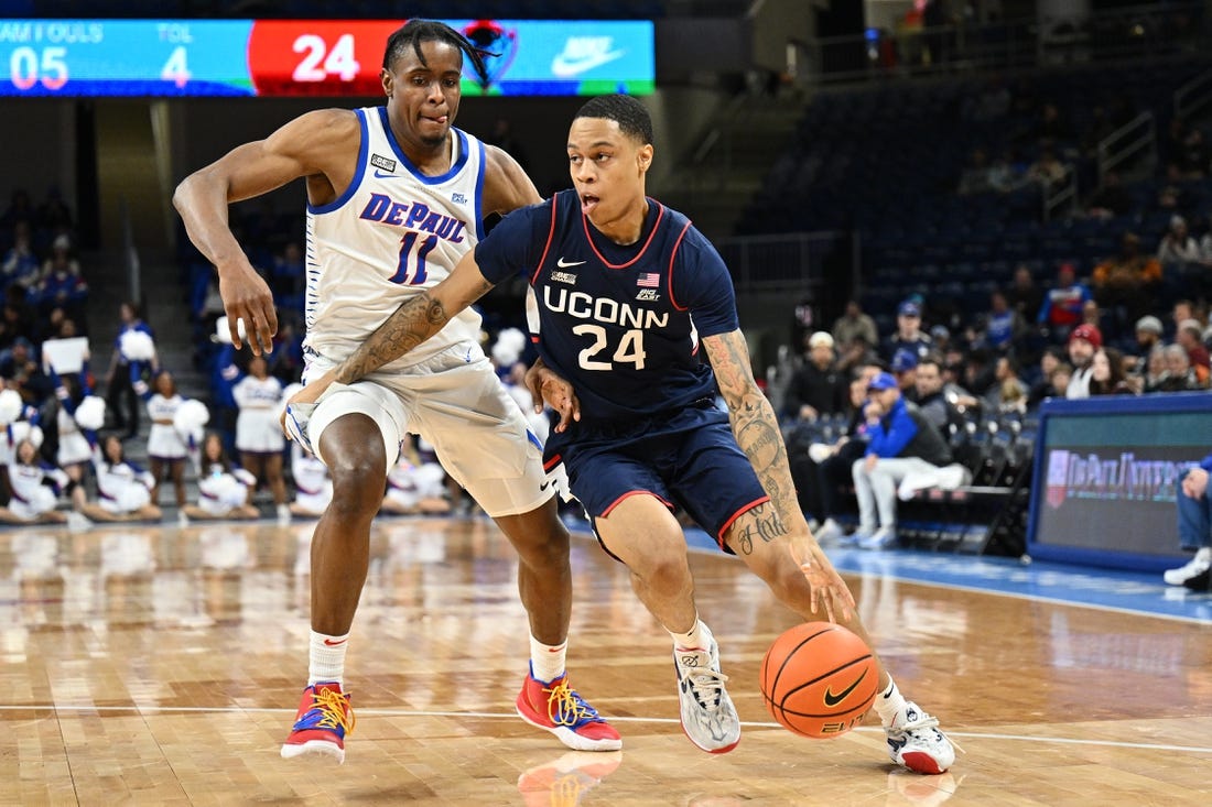Jordan Hawkins scored a game-high 26 points and Adama Sanogo finished with 25 to help No. 24 Connecticut extend its winning streak against DePaul to 15 games by earning a 90-76 road victory Tuesday night.