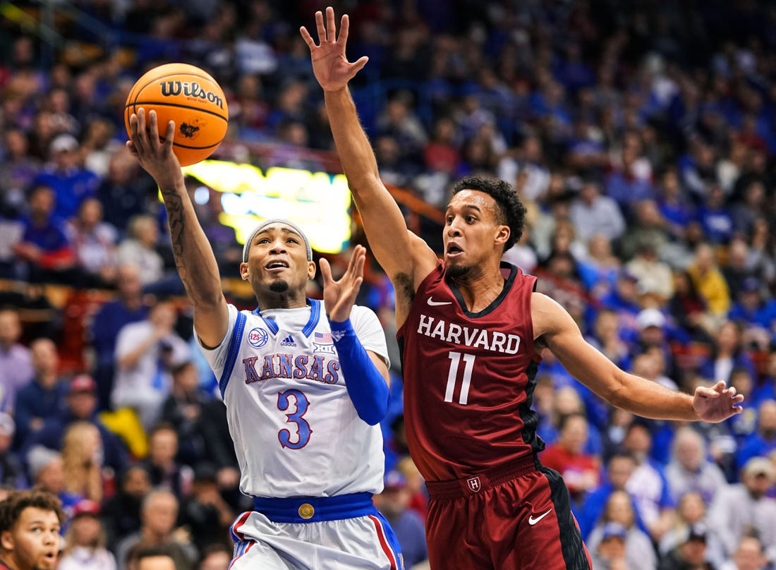 Dajuan Harris Jr. sank all five of his attempts from 3-point range on the way to finishing with a career-high 18 points. Harris’ willingness to test his range from beyond the arc was a welcome sight for Kansas coach Bill Self.