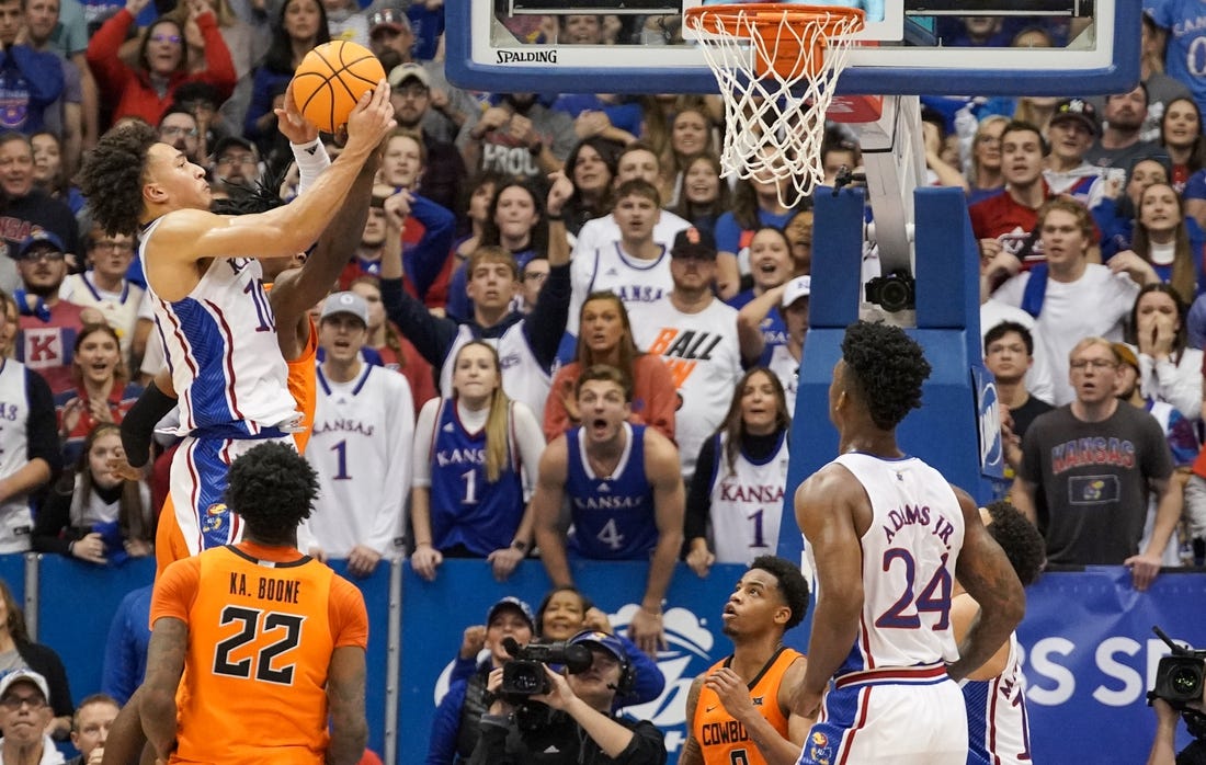 KJ Adams Jr. hit a driving layup in the final seconds to provide Kansas (12-1, 1-0 Big 12) with the winning points in a 69-67 victory against the Cowboys. The Jayhawks had fallen behind by 15 at halftime.
