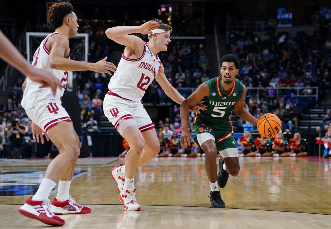 Norchad Omier finished with a game-high 17 rebounds to go along with seven points, which helped Miami outrebound Indiana 48-31, including 20-12 on the offensive glass.