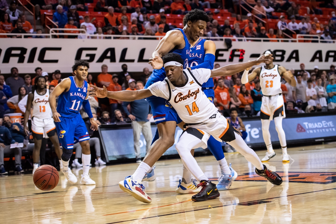 That bucket triggered a quick flurry as Kansas snapped a halftime tie by canning its first five 3-point attempts of the second half. A 13-3 run enabled the Jayhawks to boost the lead into double digits before holding on against the pesky Cowboys (7-5, 0-1).