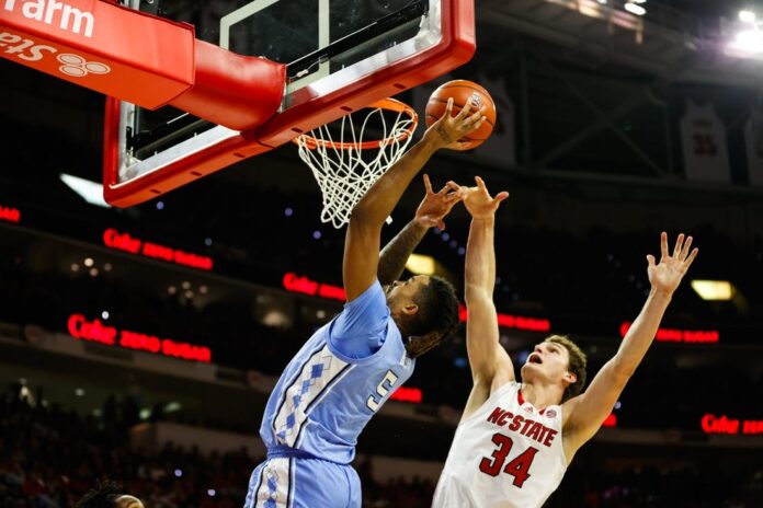 The game was tightly contested in the first half, with NC State leading by as many as four points while UNC led by as many as six. The lead changed hands three times and the Tar Heels took a two-point advantage into intermission, largely thanks to eight first-half points from Cormac Ryan and 10 first-half rebounds from Ingram, the latter of whom shined in the opening frame as Bacot played just 10 minutes.