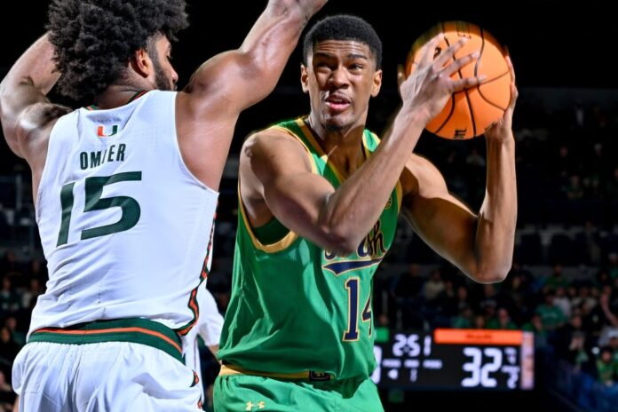 J.R. Konieczny’s 3-pointer capped a 7-0 run that gave Notre Dame (7-12, 2-6) a 52-49 lead with 9:24 remaining in the game. However, Miami answered with a 17-2 spurt that featured runs of 7-0 and 10-0. The final run was highlighted by a key 3 from George with 4:09 to play and the final dunk of the night from Omier, who was two points shy of matching his career high.