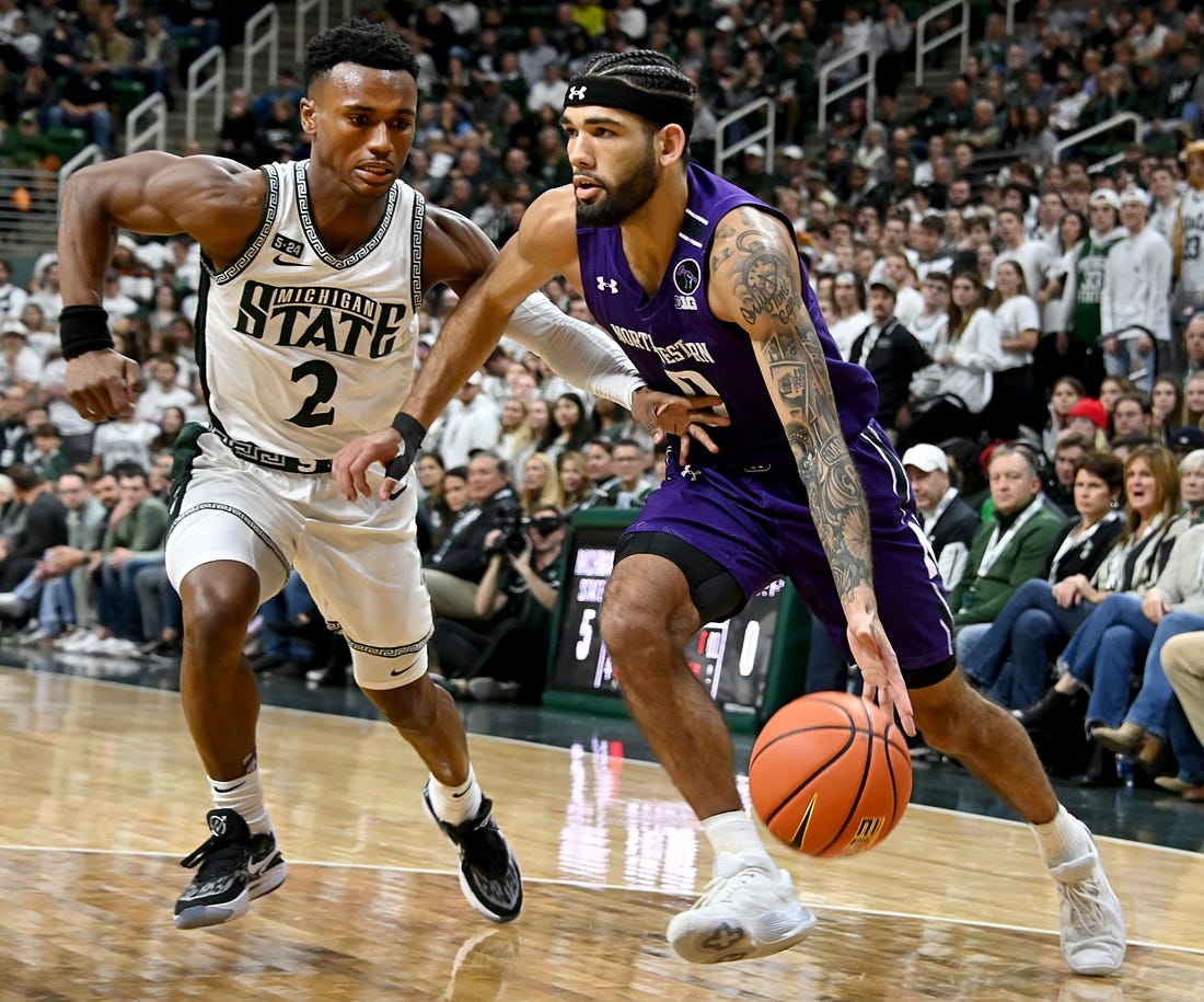 Michigan State held a 27-20 lead with 8:25 remaining in the first half, but Northwestern went on a 9-2 run to tie the game at 29-29 with 4:53 left until halftime.
