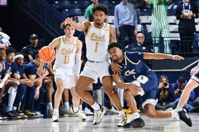 Ndongo’s layup got Georgia Tech within a point with 38 seconds left, but after Burton missed a jumper, the Irish kept the ball alive. Logan Imes snagged the long rebound and got the ball to Burton, who was fouled, then sank a pair of free throws with 1.2 seconds remaining.
