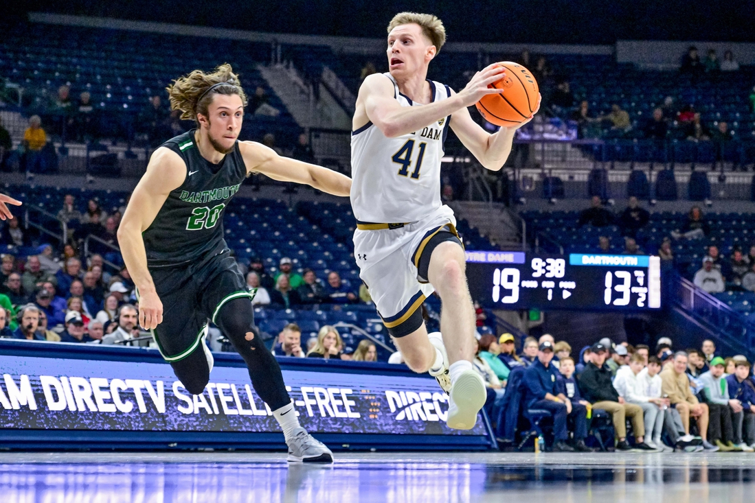 Dartmouth switched to a 3-2 zone to limit Notre Dame’s drives, and the Big Green trimmed a 23-13 deficit to 25-21. Jayden Williams (13 points) rained in a 3-pointer, Connor Amundsen (10 points) drove for a layup and Romeo Mythril slashed for a layup that became a three-point play.