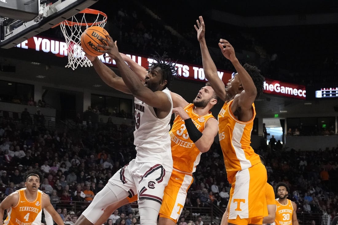 Olivier Nkamhoua poured in a season-high 21 points on 10-for-10 shooting from the field in No. 8 Tennessee’s 85-42 blowout of South Carolina on Saturday afternoon in Columbia, S.C.