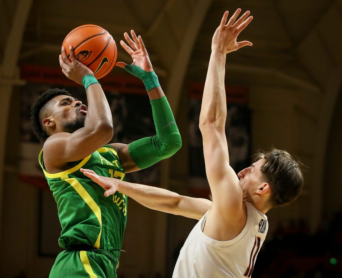 Oregon led by as many as seven points in the first half but lost that lead after the midway point of the first 20 minutes. During a stretch of cold shooting for the Ducks, the Beavers took a 29-27 lead on Akanno’s 3-pointer with 3:54 to go. Akanno’s 17 points led the Beavers.